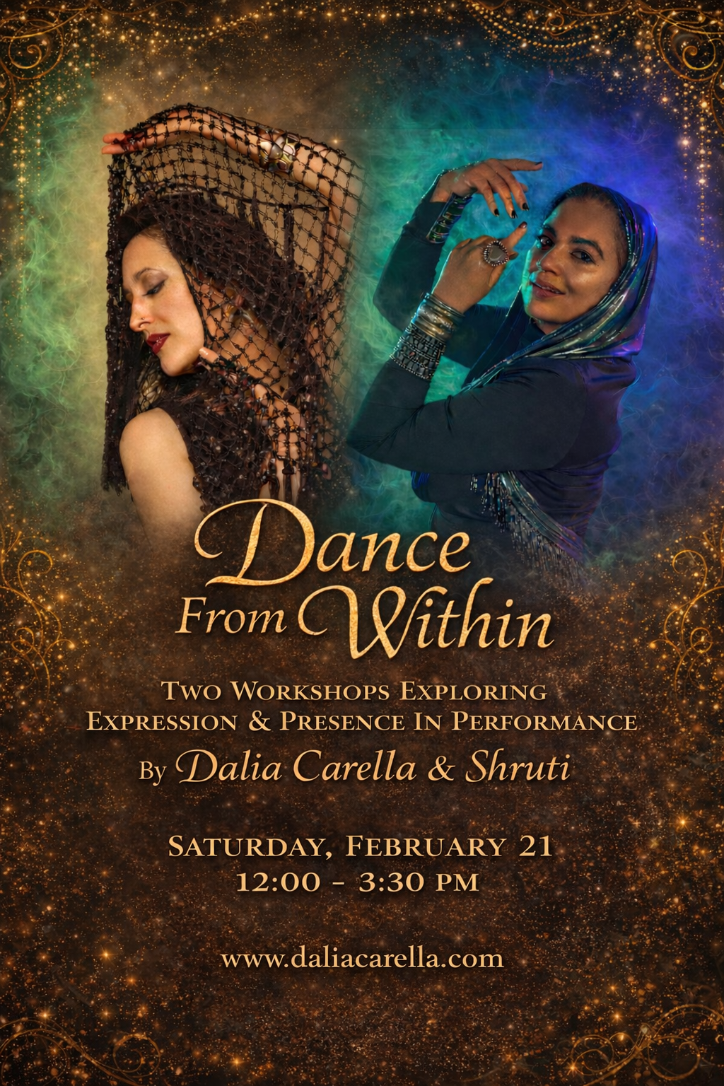Join Dalia Carella and Shruti for two special workshops offering a unique, creative approach to becoming a powerful performer which guides dancers to move from the inside out—cultivating confidence, presence, and embodied expression.